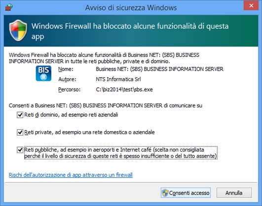 SBS per funzionare deve essere configurato per poter accedere in ingresso e uscita a tutte le reti. Su S.O. Windows non di tipo server dovrebbe apparire automaticamente la finestra in questione. Nel caso in cui non appare, lavorare direttamente nella configurazione del firewall, sia esso di Windows, di terze parti, software o hardware.
