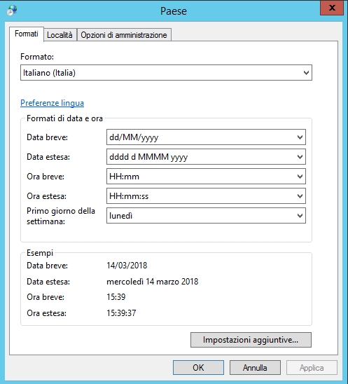 Nota: consigliamo pertanto di impostare la lingua italiana nelle impostazioni del paese, per evitare che client e server non comunichino correttamente.