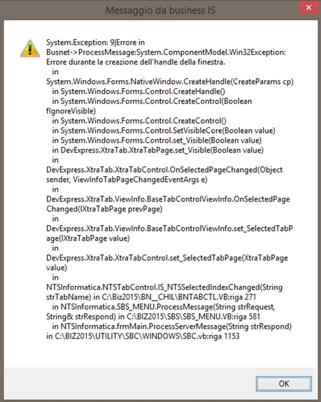 Impostando Smart Business Framework, sbs, con le attività pianificate di Windows, dopo aver aperto un certo numero di sessioni di SBC (anche solo al menu, senza child aperti) viene scatenato l'errore 9 – impossibile creare l'handle: Sstem.Exception: 9 Busnet--> ProcessMessageSystem.ComponentModel.Win32Exception Errore durante la creazione dell'Handle della finestra. in System.Windows.Forms.NatveWindow.CreateHandleCreateParam.cp)
