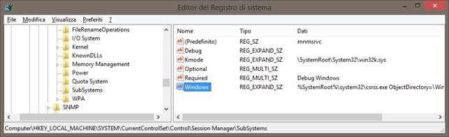 La stringa di default per windows 8 è: %SystemRoot%\system32\csrss.exe ObjectDirectory=\Windows SharedSection=1024,20480,768 Windows=On SubSystemType=Windows ServerDll=basesrv,1 ServerDll=winsrv:UserServerDllInitialization,3 ServerDll=sxssrv,4 ProfileControl=Off MaxRequestThreads=16