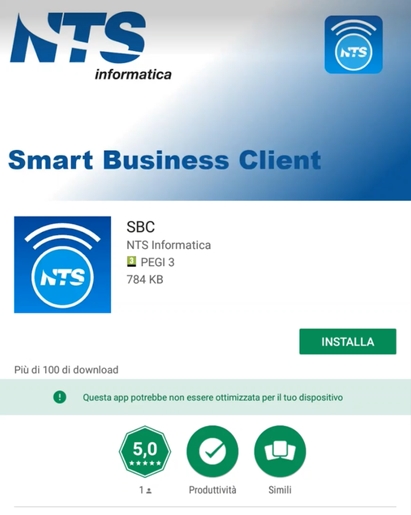 L'installazione sui dispositivi Android / IOS viene fatta direttamente dal Play Store / App Store, cercando e selezionando 'SBC di NTS Informatica' fra le applicazioni disponibili (nell'esempio qui sotto la applicazione sul Play Store).