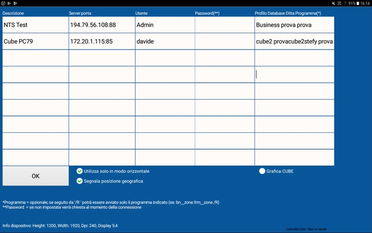- Programma (*) possibilità di inserire in modo opzionale il programma da lanciare alla connesione. Se seguito da parametro restricted /R questo disabilita il menu e quando si chiude il programma si disconnette in automatico. Per esempio BNREMENU.FRMREMENU /R