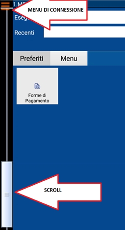 Cliccando sul pulsante indicato qui sotto, appare il menu di connessione, e i programmi aperti. Cliccando nuovamente, viene nascosto il menu (immagine a destra). Il menu viene nascosto di default per aumentare l'area visibile. Inserita gesture di trascinamento con due dita da sinistra a destra per mostrare il menu con connetti, disconnetti, programmi aperti ... Se si è in modale il menu è comunque visualizzato, ma è bloccato.Gesture opposta per nasconderlo.