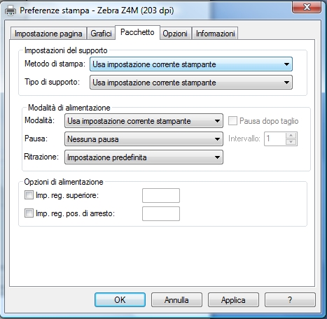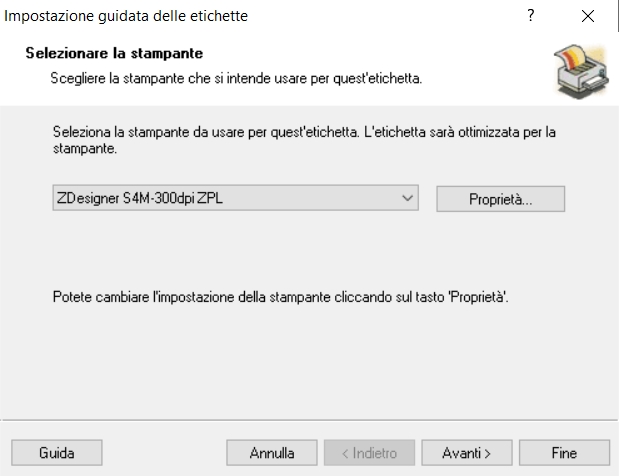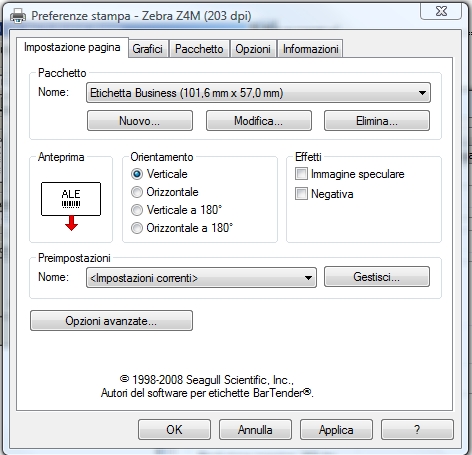 1) Da file/Imposta stampante impostare il driver Zebra Z4M e come formato carta il formato personalizzato: