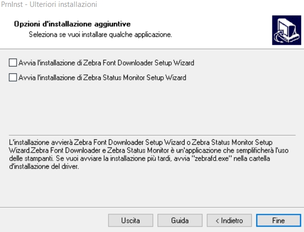 Togliere il flag di avvio installazione Zebra Font Downloader Setup Wizard e terminare l'installazione guidata: