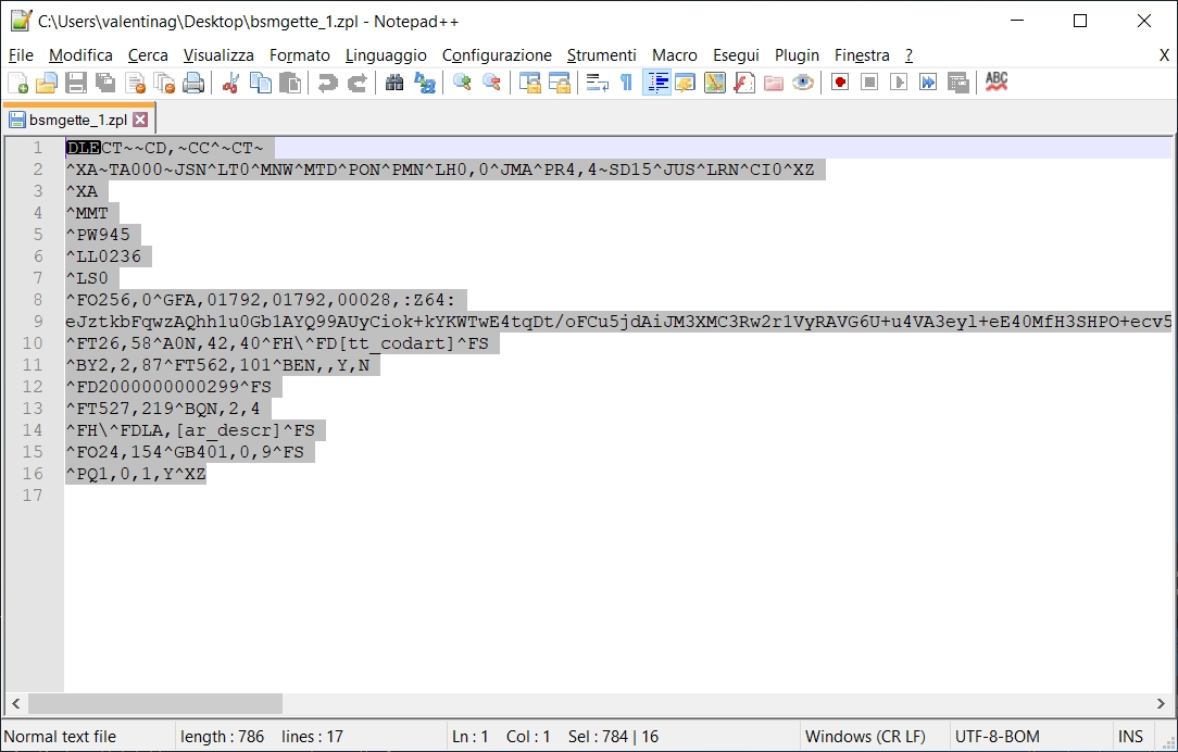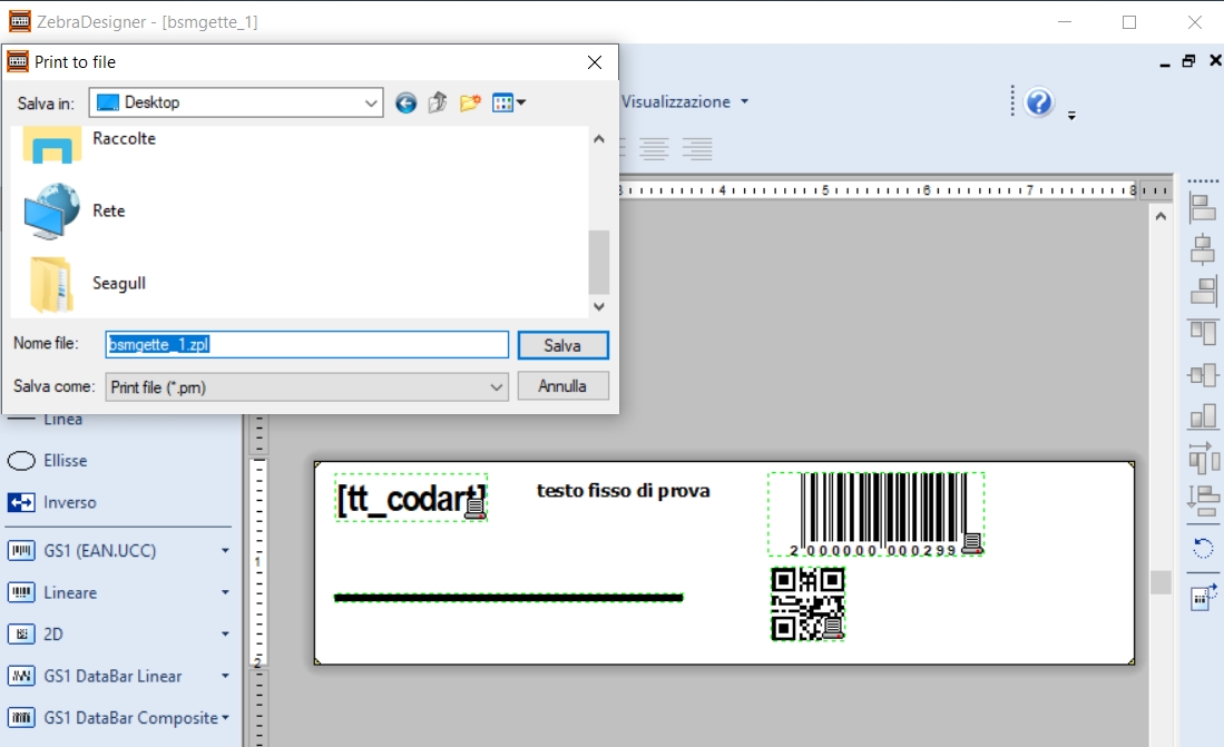 Utilizzo di stampa diretta con modello .ZPL: con questo motore di stampa non si utilizza più Crystal Reports, ma i comandi ZPL specifici della stampante; richiede quindi che la stampante stessa supporti il linguaggio ZPL. La procedura è la seguente: