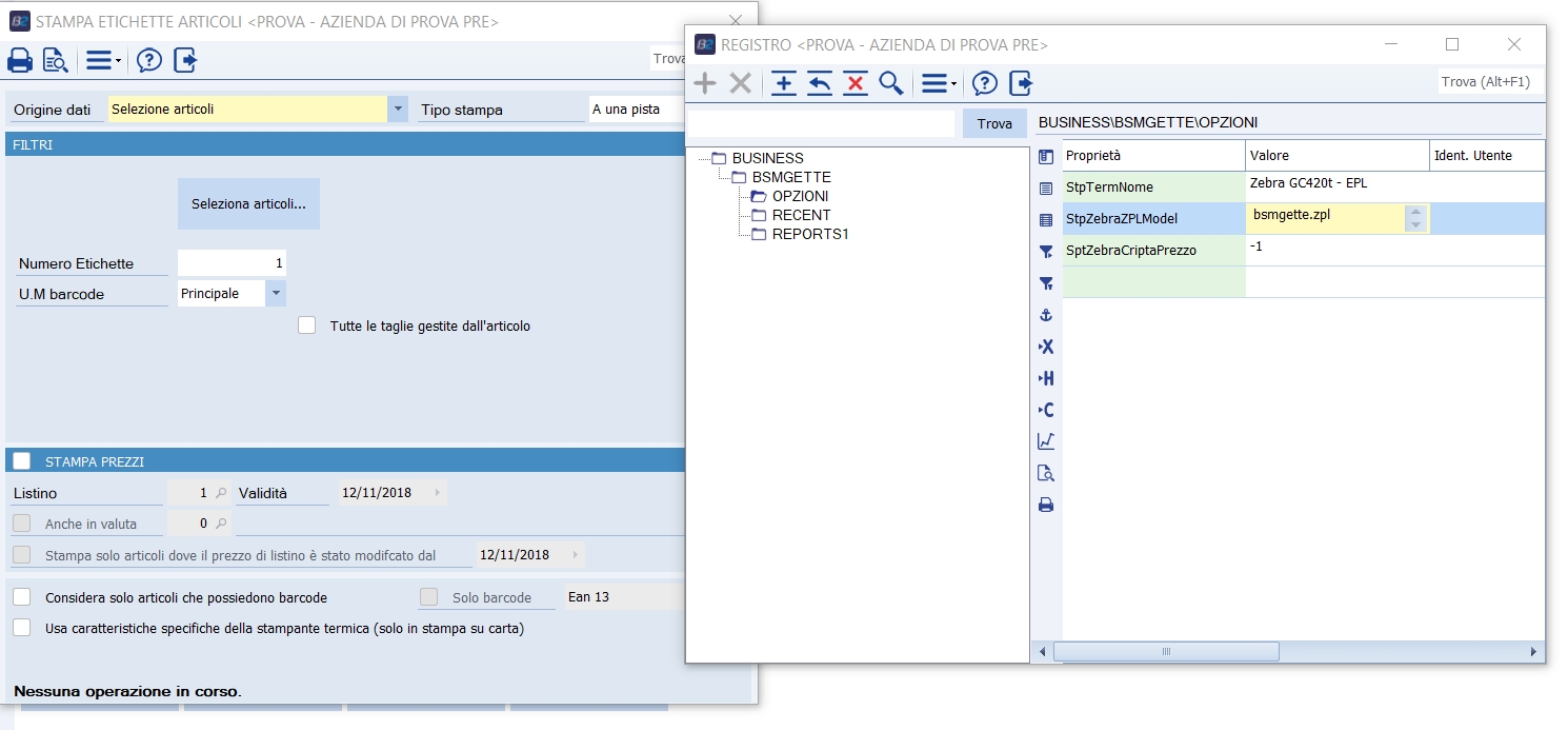 Per utilizzare questa funzionalità occorre preventivamente aver settato le seguenti opzioni nel registro di Business nella cartella Bsmgette/opzioni; le impostazioni dell'esempio si riferiscono ad una ELTRON 2746: