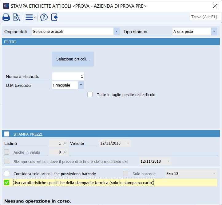 Infine flaggre il campo Usa Caratteristiche specifiche della stampante termica (solo in stampa su carta), così che, stampando su carta, verrà stampata l'etichetta sfruttando esclusivamente il driver della stampante: