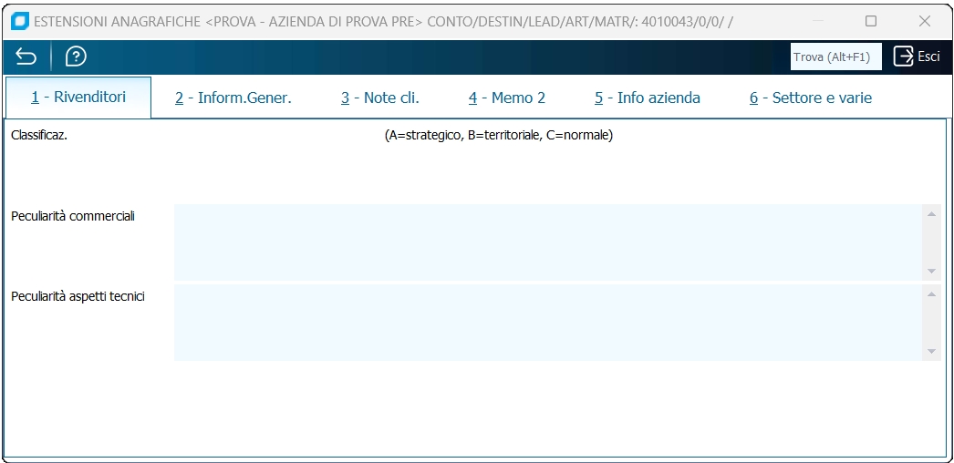 La seguente modale è richiamabile dal menu dei programmi di gestione delle anagrafiche clienti/fornitori, lead, matricole, ubicazioni e articoli, permettendo di inserire i dati specificati in fase di Definizione estensioni.
