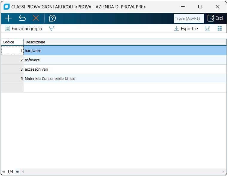 Questo programma gestisce la tabella relativa alle classi provvigione degli articoli. La tabella č utilizzata per raggruppare gli articoli in classi aventi la stessa percentuale di provvigione. Ciņ permette di variare un solo dato quando la percentuale di provvigione relativa ad una determinata classe deve essere modificata, altrimenti si sarebbe dovuto intervenire in ogni anagrafica degli articoli interessati.