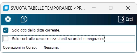 Solo controllo concorrenza utenti su ordini e magazzino Attivando questa spunta il programma procede con la cancellazione della sola tabella temporanea TTKEYS dei dati relativi al controllo di concorrenza utenti su ordini e magazzino (controlli attivabili tramite l'opzione OPZIONI\ControllaConcorrenzaOggetti). A seconda di come è settata la spunta sopra Solo dati della ditta corrente la temporanea TTKEYS verrà svuotata per la sola ditta corrente oppure per tutte le ditte del database.