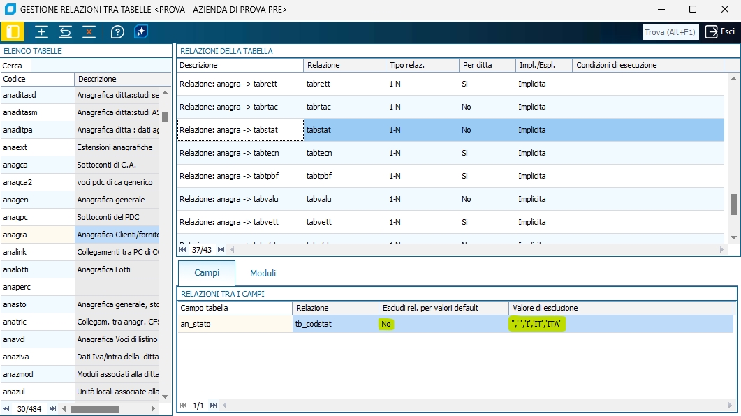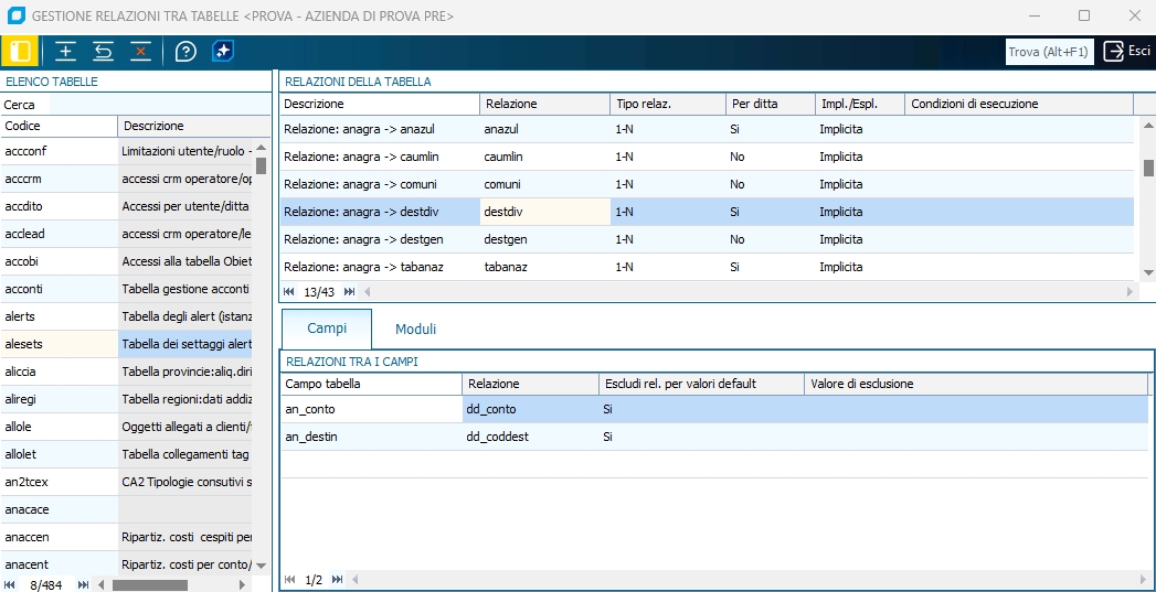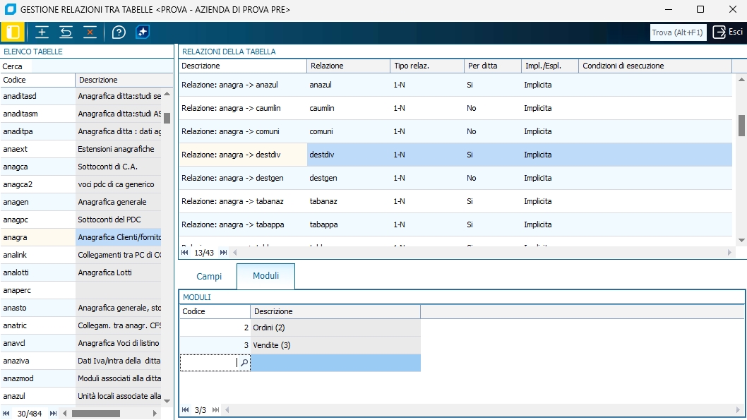 Il programma in questione consente la gestione di tali relazioni tra tabelle. Sulla sinistra è presente una griglia con le tabelle, nella parte restante in alto la griglia che riporta le relazioni della tabella selezionata ed in basso un tab control dove imputare i campi della relazione e dove inserire i moduli a cui la relazione appartiene. Tali relazioni possono essere stampate con la stampa relazioni tra tabelle, oppure possono essere utilizzate dal programma controllo coerenza dati per fare delle analisi sulla "qualità" dei dati, ad esempio in seguito ad importazioni di dato dall'esterno. Ad esempio controlli di questo tipo possono evidenziare la presenza di articoli con un indicato un cod. marca non presente nella relativa tabella delle marche TABMARC.