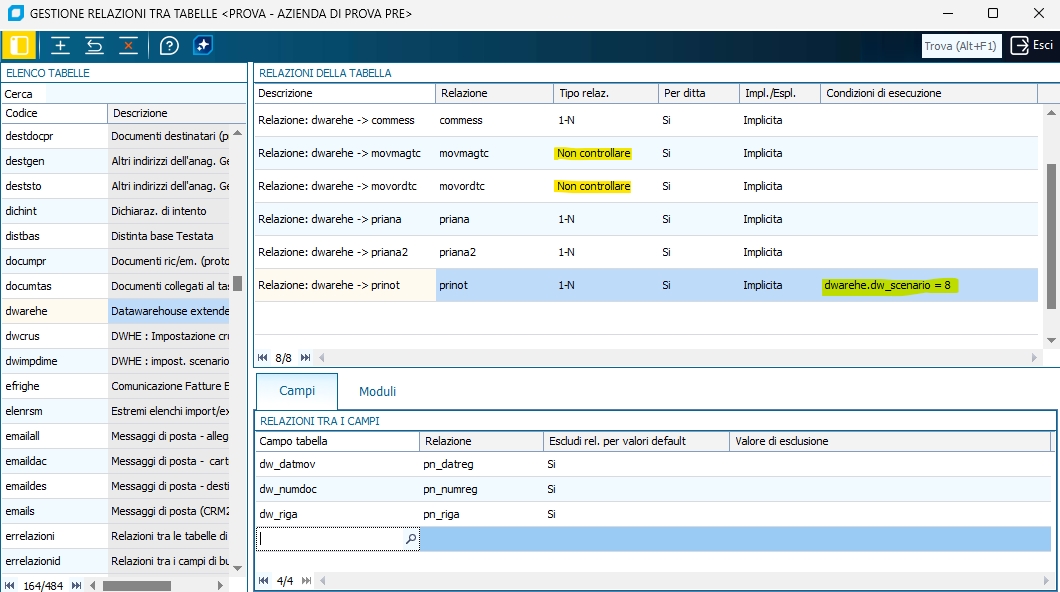 È possibile impostare una condizione di esecuzione del controllo della relazione (deve essere una condizione di 'WHERE' di SQL), ad esempio nella tabella 'dwarehe' verificare l'esistenza della relativa registrazione di prima nota solo nello scenario della contabilità generale: