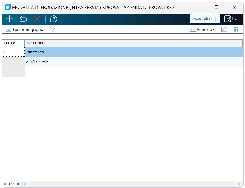 Codice Inserire il codice che identifica la Modalità d'erogazione. Descrizione Inserire la descrizione, ad es. "Istantanea", ecc. |