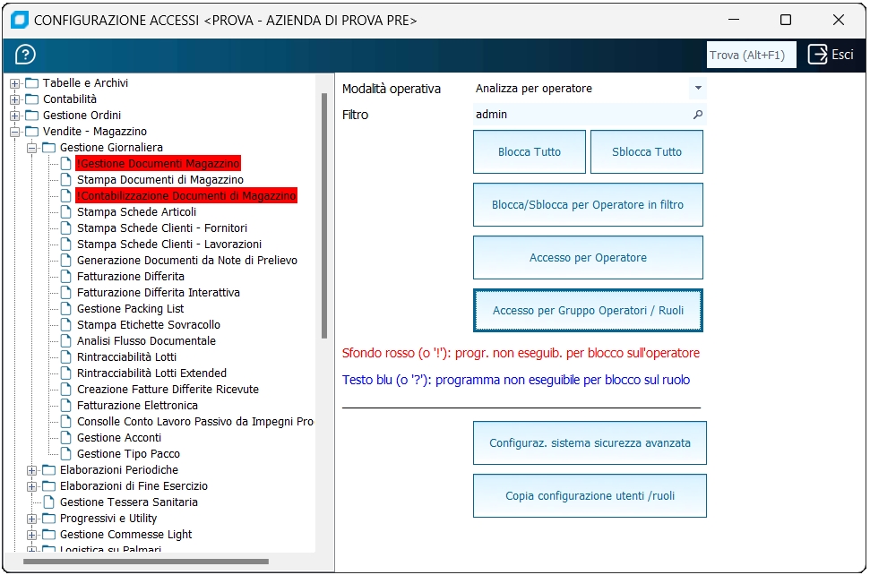 La maschera principale propone a sinistra un menu treeview navigabile, con le sole voci abilitate in Inizializzazioni comuni globali, che consente di selezionare i nodi sui quali effettuare le configurazioni. Intervenendo sulla modalità operativa , sul filtro e cambiando operatore o gruppo operatore è possibile controllare quali voci di menu possono essere eseguite dall'utente; sono visualizzati con sfondo rosso i programmi o i menu non eseguibili per un blocco specifico sull'utente, in testo blu per un blocco specifico sul gruppo operatori. Blocca/Sblocca tutto per abilitare o disabilitare tutte le voci di menu per l'operatore/ruolo indicato, la funzione serve per rendere più facile la configurazione del menu nel caso si debbano mostrare ad un utente solo determinate voci. Blocca/Sblocca per Operatore in filtro, Blocca/Sblocca per Ruolo in filtro Con i comandi blocca/sblocca per operatore o per ruolo, è possibile abilitare o disabilitare, per l'operatore/ruolo indicato, la voce di programma su cui si è posizionati. Accesso per Operatore, Accesso per Gruppo Operatori / Ruoli I comandi "Accesso per operatore" e "Accesso per ruolo" danno accesso a specifiche schermate che permettono di abilitare o meno il programma collegato alla voce di menu su cui si è posizionati, rispettivamente a seconda dell'operatore o del gruppo operatore. Copia configurazione utenti /ruoli Il comando "Copia configurazioni utenti/ruoli" dà accesso all'omonimo programma, che copia da un utente ad un altro anche le impostazioni del Registro di Business e di copiare, sempre distinguendo per utente o ruolo, le limitazioni di accesso ai programmi. Sia nello zoom che in validazione dei ruoli, vengono considerati solo i ruoli presenti negli operatori (tabella OPERAT). Quindi, un ruolo, in tabella ruoli, che non esiste in alcun operatore, non viene visualizzato nello zoom e non viene accettato se indicato a mano. Aggiorna menu Tale pulsante ricarica il menu treeview con le impostazioni di accesso attualmente memorizzate in base alla modalità operativa e al filtro impostato. Configuraz. sistema sicurezza avanzata Lancia la finestra modale di configurazione sistema sicurezza avanzata per la configurazione delle limitazioni all'utilizzo di programmi con determinate causali, magazzini e tipi bolla fattura. Per impedire il blocco involontario dello stesso amministratore, il ruolo amministratori non può essere bloccato su "Tabelle e archivi", "Archivi Procedura", "Configurazione Accessi". |