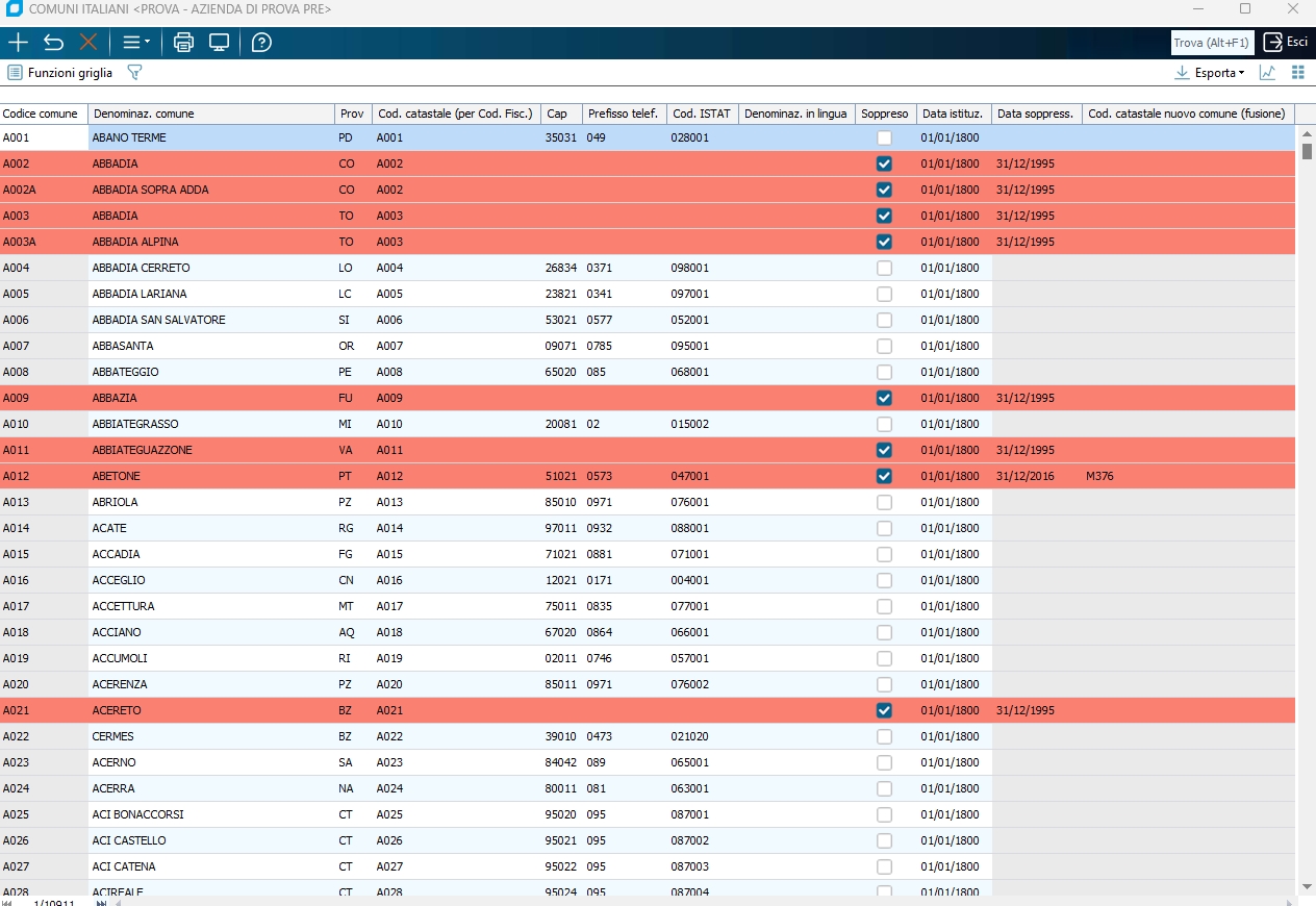 Colorati con sfondo rosso i comuni soppressi, presente in griglia un flag "Soppresso", abilitato di default ma recentato per operatore/ditta, che consente di mostrare tutti i comuni (compresi i soppressi).
