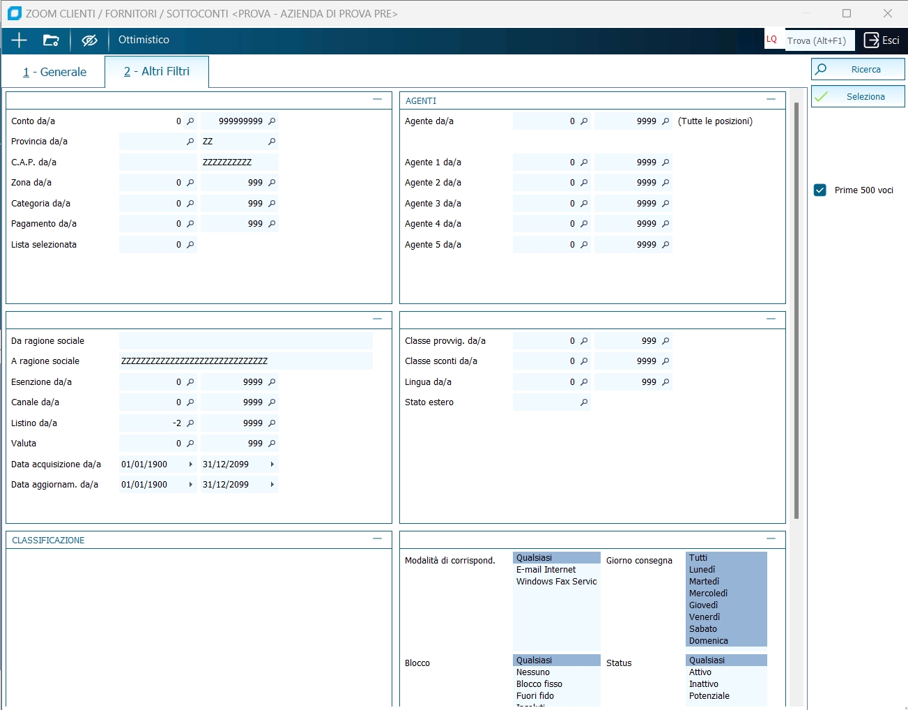 Attraverso questo zoom di ricerca è possibile ricercare i conti clienti, fornitori e sottoconti creati sulla ditta di lavoro. Lo zoom in questione non sempre presenta la griglia in quanto a volte viene richiamato per effettuare un range di selezione, quindi per selezionare un insieme di conti. Quando si lavora sul tipo clienti o fornitori, se selezionato il CheckBox "C/F movim. magaz.ultimi 6 mesi", visualizza le anagrafiche movimentate indipendentemente dall'operatore che sta facendo l'interrogazione.