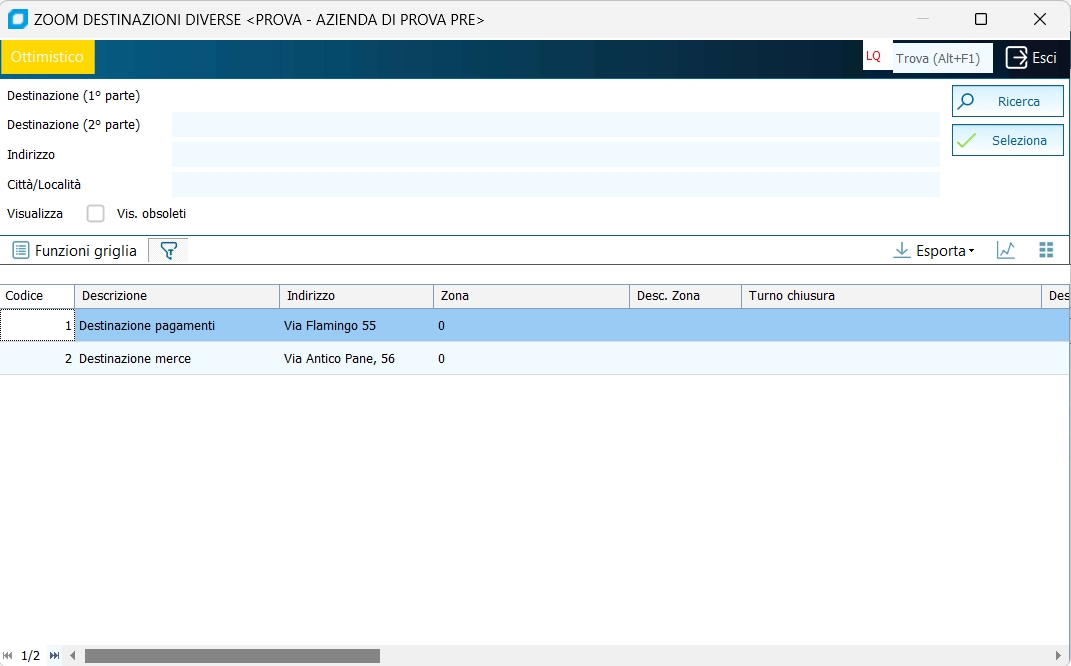 Da questa maschera è possibile visualizzare tutte le destinazioni diverse che sono state create. In tali maschere sono presenti tutte le informazioni delle ulteriori sedi di cui i vari clienti/fornitori possono disporre. Vengono elencate tutte le principali informazioni che riguardano gli indirizzi delle ulteriori sedi che possono avere rilevanza ai fini contabili e commerciali, i vari recapiti telefonici ed elettronici per poter avere un contatto con tali sedi. |