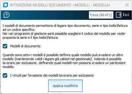 Da qui è possibile aprire il programma "Attivazione modelli documenti", rimando alle descrizioni all'interno del programma per maggiori informazioni.