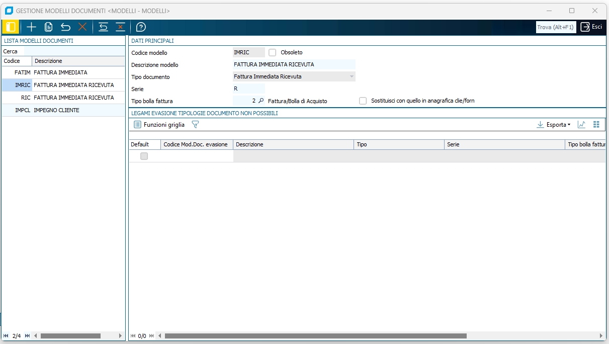 È stata aggiunta la voce 1-6-S per poter gestire i modelli di documento e scegliere i legami di evasione (o non evasione, in base alla configurazione precedente) tra i documenti.