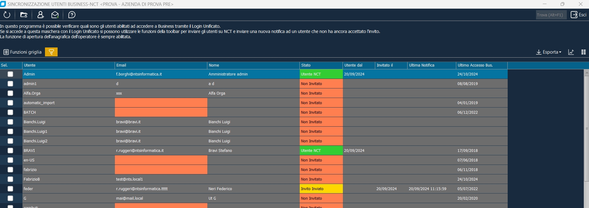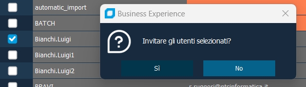 Il pulsante di invito , effettua l'invio di una mail di invito a NCT, per tutti gli utenti selezionati in griglia: