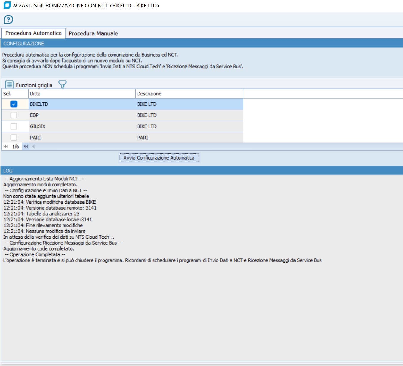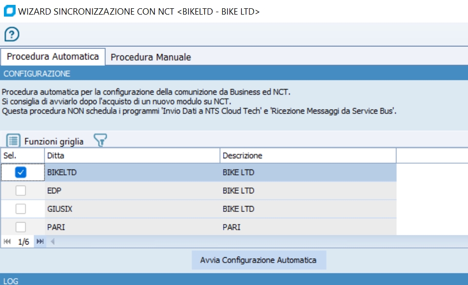 Selezionare la Ditta che si vuole sincronizzare sul cloud e cliccare sul bottone "Avvia Configurazione Automatica". Verrà aperto nella prima fase il programma per la Sincronizzazione Utenti verso NCT, fare riferimento al programma Sincronizzazione Utenti Business - NCT per la guida.