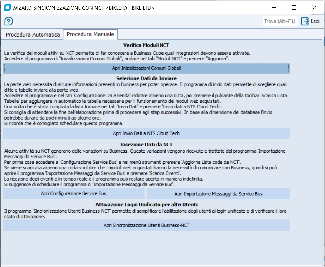 La procedura Manuale, permette invece di poter lanciare i singoli programmi utilie alla configurazione di NCT. All'interno di ogni paragrafo viene indicato in modo sintetico le funzioni di quel modullo.