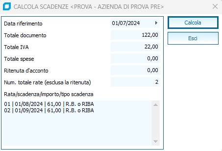 Menu Strumenti | Calcola Scadenze (F7) La funzione abilita una schermata in cui è possibile testare il pagamento appena inserito.