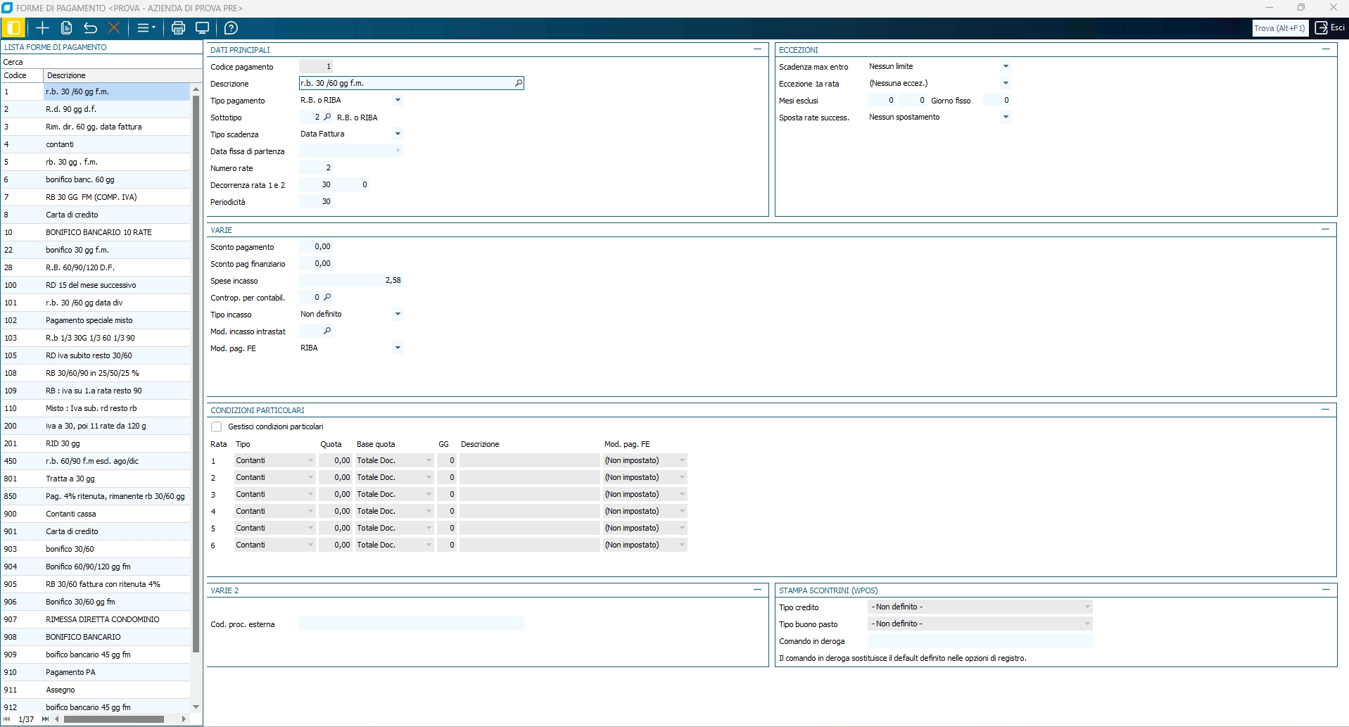 Con questo programma è possibile inserire, modificare, cancellare e duplicare le forme di pagamento utilizzate con fornitori e clienti che si rapportano con l'azienda. L'inserimento di questa tabella può essere omesso se si ha attivo solo il modulo di contabilità generale e non s'intende gestire lo scadenzario.