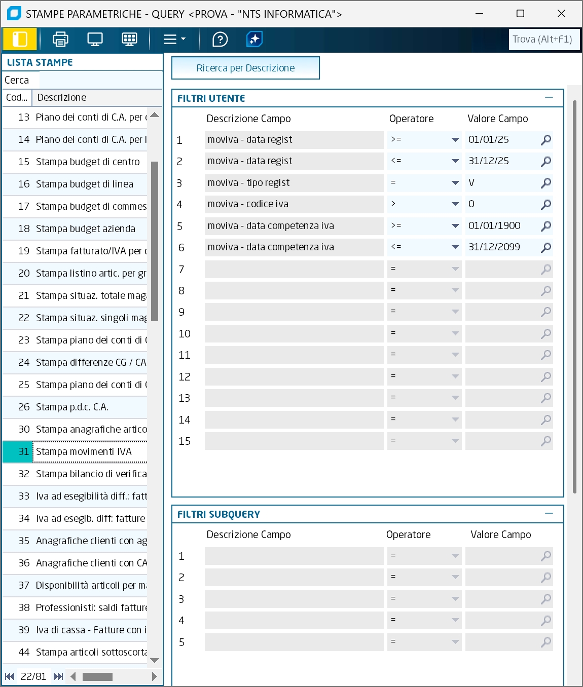 NB: durante l'elaborazione delle stampe paramentriche query di tipo UPDATE/DELETE/INSERT non è possibile inserire dei filtri, al contrario delle SELECT oppure dei file RPT ove invece i 15 filtri sono operativi. Questo è un comportamento voluto per motivi di sicurezza e anche impostando dei filtri questi non veranno valutati al momento dell'esecuzione della query.