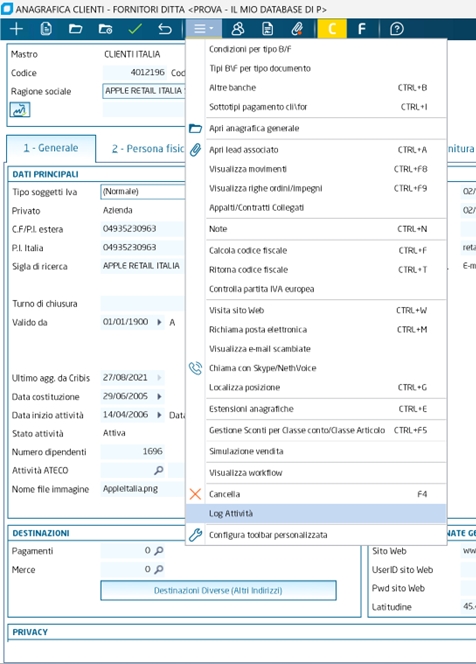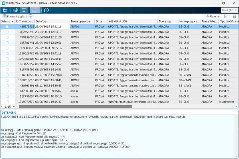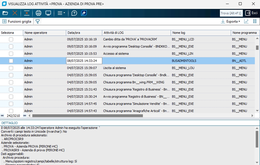 Se è attivata la gestione del log delle attività, questo programma visualizza l'elenco delle attività eseguite, sia quelle relative a modifiche e cancellazioni (di documenti, anagrafiche, ecc.), sia quelle relative all'esecuzione di elaborazioni massive, ad es. Contabilizzazione fatture, Stampa libro giornale in definitivo, ecc. Per attivare la gestione del log occorre impostare a -1 da registro di Business le proprietà globali ScriviActLogD e ScriviActlogE, oppure settando la proprietà ScriviActlog sulla cartella OPZIONI dei singoli programmi. I programmi che gestiscono la scrittura nel log solo quelli che trattano i dati più significativi, e relativi ai moduli più importanti/usuali. Nel log sono memorizzate solo le modifiche a documenti e archivi, e non nuovi inserimenti di dati, e le sole attività di elaborazione massiva che aggiornano uno o più archivi. Ad es., la stampa libro giornale in definitiva si, la stampa in prova no. All'avvio di Business, con periodicità settimanale, è presente un coltrollo per segnalare la presenza di un numero elevato di voci nel Log delle attività (oltre il milione) consigliando la rimozione delle voci vecchie. Tali controlli controllo avvengono solo per gli operatori che hanno impostato il nuovo flag 'Ricevi messaggi dal sistema' in 'Gestione operatori'. Solo gli utenti amministratori possono accedere al programma ed eliminare i log. Inoltre, nessuno può eliminare i log degli ultimi 3 mesi.