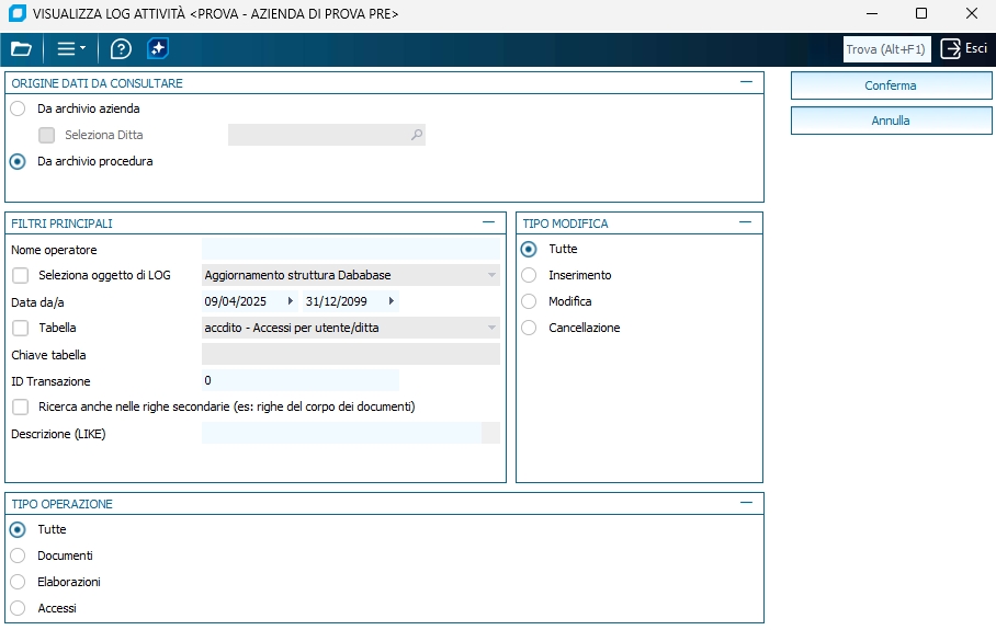 Tipo modifica Per le operazioni su documenti/archivi/tabelle, indicare se prelevare solo le modifiche, solo le cancellazioni oppure entrambe. Tipo operazioni Specificare se si vogliono interrogare solo le attività relative a modifiche e cancellazioni, o quelle relative all'esecuzione di programmi di elaborazione massiva, o entrambi i tipi.