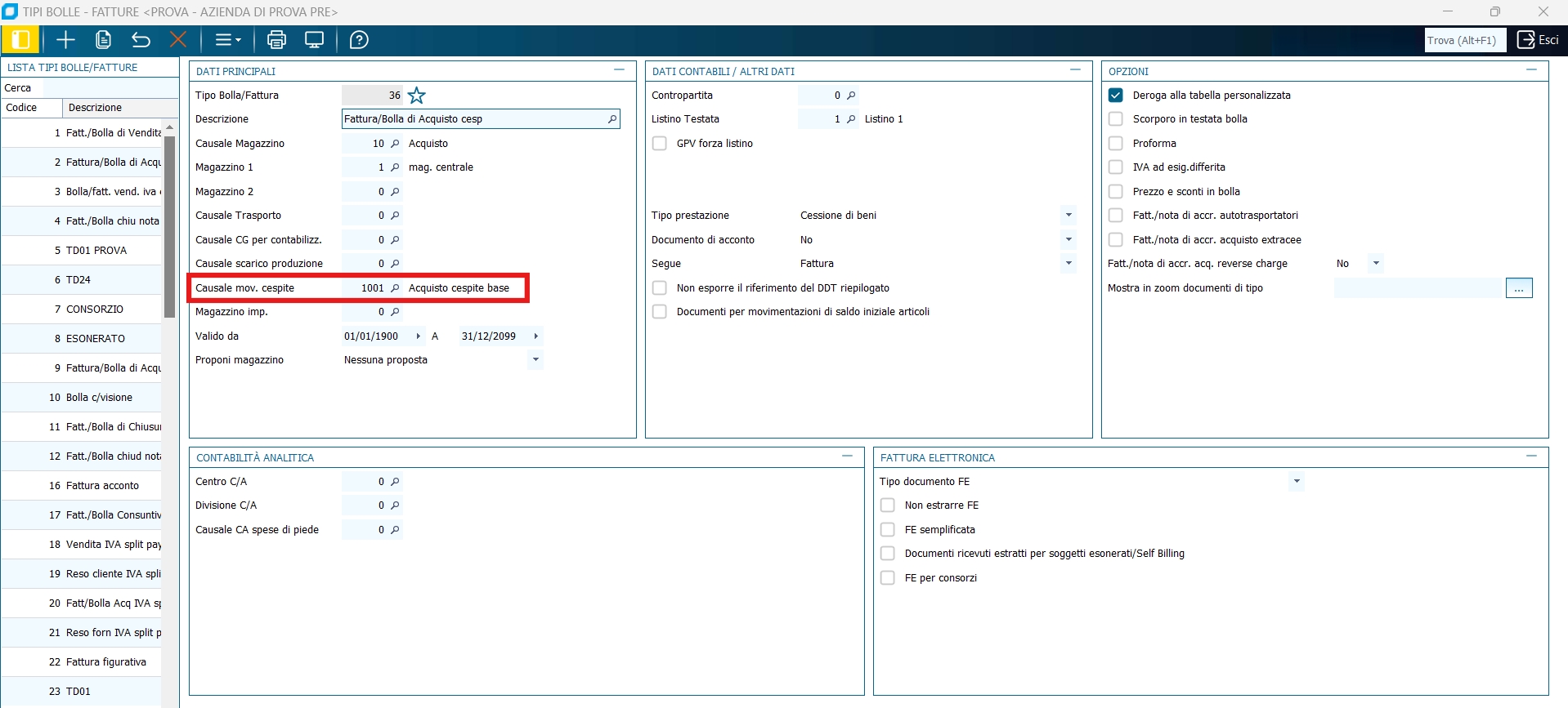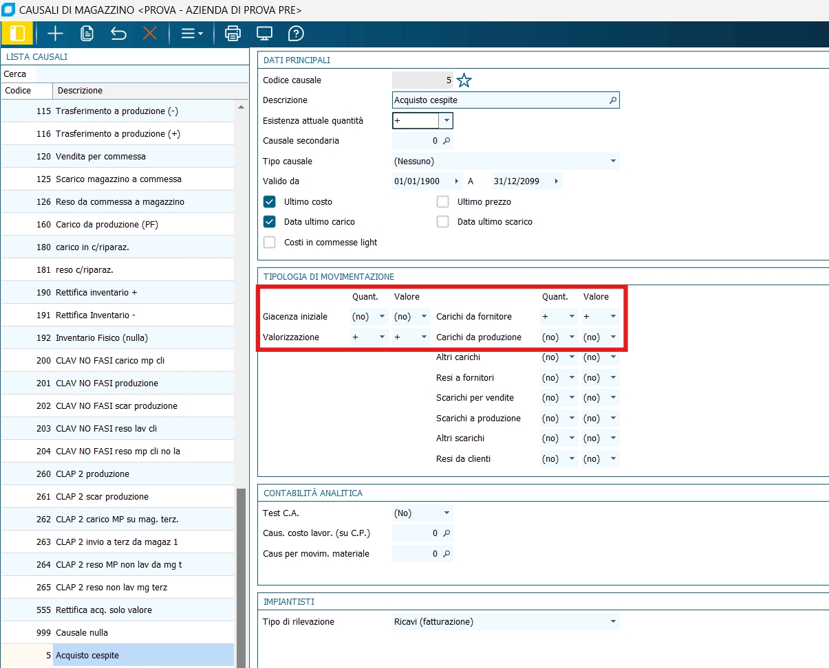 È necessario creare (per quanto riguarda gli ordini) un Tipo B/F specifico con valorizzato al suo interno il campo "Causale movimentazione cespiti" (riguarda solo gli ordini poiché da magazzino viene verificata la causale di riga nel corpo del documento così da poter creare documenti con righe miste sia agganciate ai cespiti che non) e che la Causale di Magazzino sia di tipo Acquisto e che sia impostata con la valorizzazione positiva e i carichi fornitori positivi.