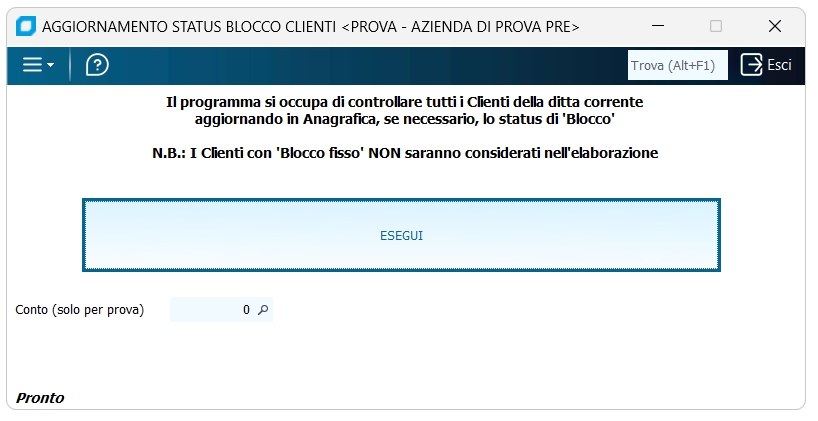 Il programma permette di lanciare in modo massivo o per un solo cliente, il controllo fido/insoluti/rd per bloccare/sbloccare i clienti a seconda delle opzioni attive in BSCGDCST\OPZIONI\.