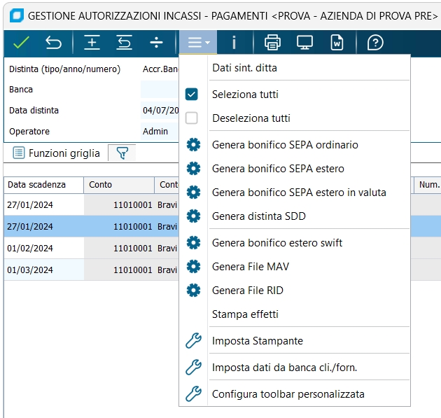 • emettere una distinta di presentazione effetti (R.B. o tratte attive) al SBF o all'incasso, operazione che è consigliabile eseguire con l'apposita funzione Gestione distinte effetti/incassi/pagamenti.