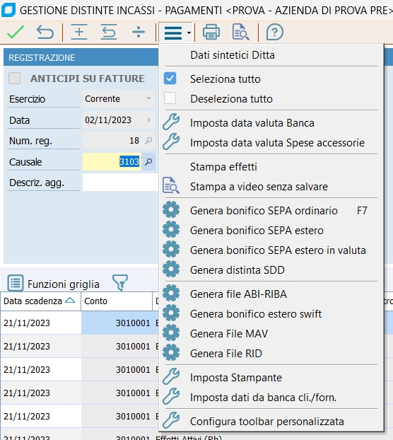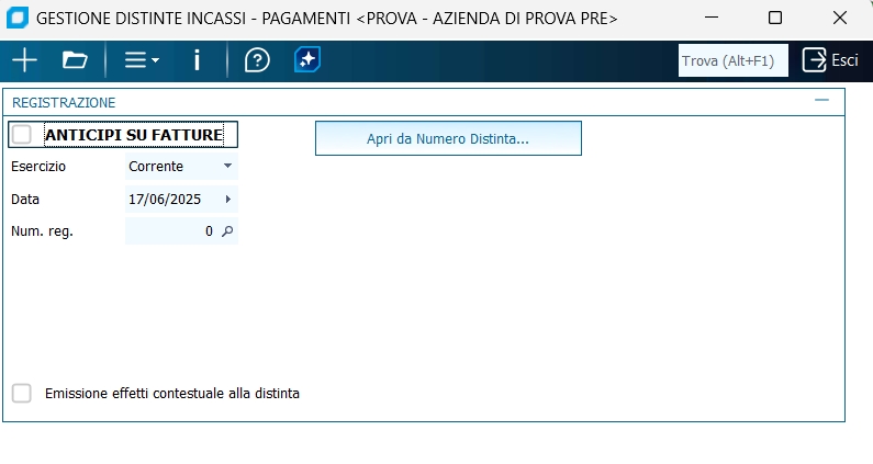 Per facilitare la gestione della griglia e la reperibilità delle righe all'interno, nel menu Strumenti sono presenti funzioni che ordinano le righe per descrizione conto, importo o data di scadenza. Nuova registrazione Chiede data e numero di registrazione da assegnare alla registrazione contabile che sarà generata, e poi di selezionare le scadenze con vari filtri; il numero della distinta è chiesto nella testata della finestra. Apri registrazione Riprende una registrazione precedentemente emessa con questo programma e varia uno o più elementi, indicando data e numero della registrazione contabile. Apri registrazione da distinta Riprende una registrazione precedentemente emessa con questo programma e di variarne uno o più elementi, indicando invece tipo e numero della distinta generata. Emissione effetti contestuale alla distinta SOLO PER RIBA.