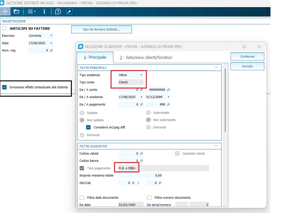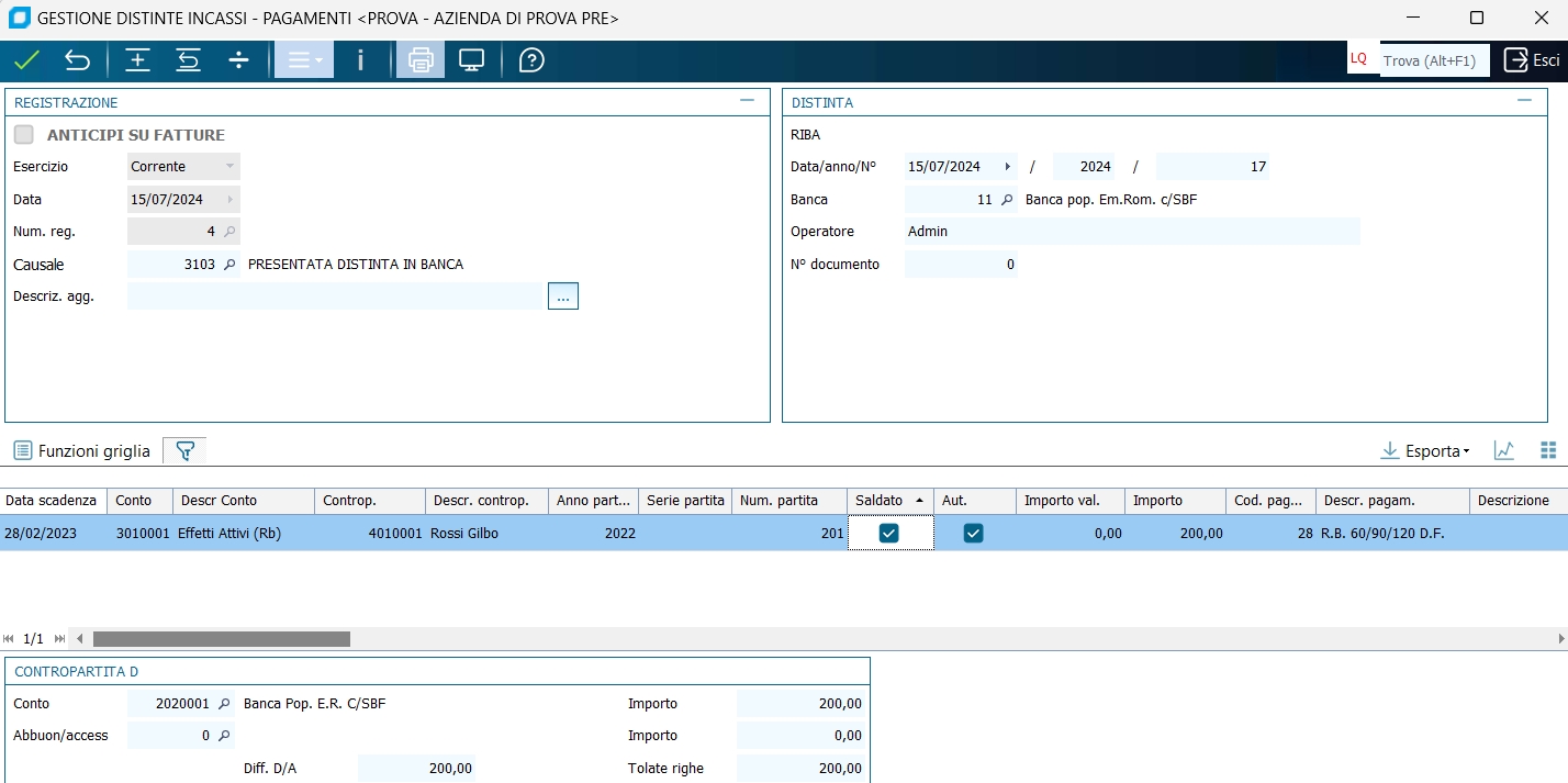 La stampa della distinta, o la generazione del file ABI o la stampa degli effetti, va effettuata prima di salvare la distinta. I pulsanti Aggiorna, Report su Video, Report su stampante, Stampa Effetti o Genera File Abi eseguono solo la singola funzione a cui sono preposti sulle righe con spunta sul campo saldato, non effettuano salvataggi. Le distinte di incasso/pagamento hanno una numerazione che è legata al tipo distinta (Tratta, Rb, R.D., Bonifici/accrediti Bancari) ed all'anno (2017, 2018, ecc.). Pertanto non v'è distinzione tra numerazione delle distinte passive e distinte attive all'interno dello stesso tipo di distinta; il tipo di distinta corrisponde al tipo di pagamento delle scadenze che vi sono contenute. Nella finestra di visualizzazione dei sottoconti da selezionare è proposto automaticamente il codice del sottoconto del PORTAFOGLIO ATTIVO, cioè RB e TRATTE attive, perché la presentazione riguarda il portafoglio. In tali casi il programma visualizza in griglia i dati della contropartita anzichè i dati del conto principale (il conto EFFETTI), cioè del cliente originario da cui l'effetto RB o tratta è stato generato con la funzione Generazione Effetti. Quando si cancella una distinta, sia sulla scadenza del cliente, che su quella sul conto effetti, non viene ripristinato il codice "Ns. banca" con quello presente sulla scadenza originaria intestata al cliente. Sarà l'utente ad intervenire manualmente sulla scadenza per ripristinare il codice "Ns. banca".