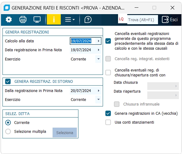 Selezione ditte Indicare se operare sulla ditta corrente oppure su un elenco o una selezione di ditte effettuata col pulsante "Seleziona". Cancella eventuali registrazioni generate precedentemente [...] Se in precedenza un'elaborazione ratei/risconti è stata eseguita con le stesse date e causali, spuntando questa casella il programma prima cancella tali registrazioni dall'archivio prima nota scelto; equivalente a rielaborazione.