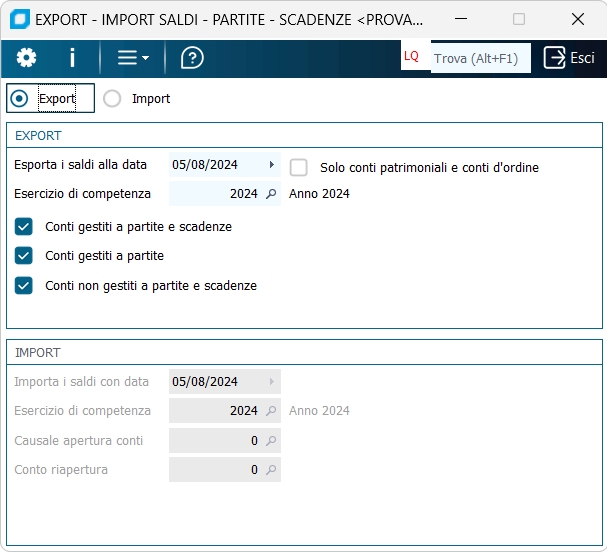 Export / Import Selezionare se eseguire un export o un import di saldi/partite/scadenze.