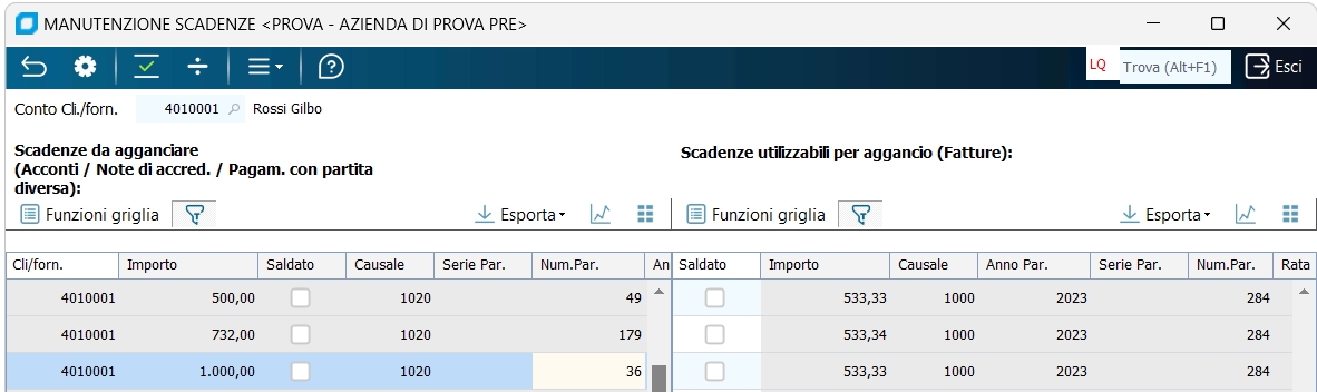 Dopo aver proposto una maschera per la selezione dei clienti/fornitori che si possono trovare nelle situazioni descritte, il programma s'articola in due griglie: - quella di sinistra contiene le scadenze da chiudere, ossia le scadenze clienti aperte in avere o le scadenze fornitori aperte in dare; - quella di destra contiene, per ogni riga di sinistra, le possibili scadenze utilizzabili per saldare le rispettive di sinistra. Per le scadenze che andrebbero inserite nella griglia di sinistra, il programma non può gestire scadenze aventi più di una rata; in queso caso occorre far riferimento ai programmi "Gestione prima nota - Selezione scadenze" e "Raggruppa scadenze". In caso di scadenza nella griglia di destra d'importo superiore alla scadenza presente nella griglia di sinistra, è possibile dividere la rata in due parti tramite il pulsante "Dividi scadenze". Per il collegamento di una scadenza presente nella griglia di sinistra con una nella griglia di destra, ci si posiziona sulla riga interessata nella griglia di SX e si spunta la casella "SALDATO" nella riga desiderata nella griglia di DX. Una volta operati tutti i possibili collegamenti tra la griglia di sinistra e quella di destra, con ELABORA F7 la procedura sostituisce i riferimenti della partita di sinistra con quelli della partita di destra, senza generare alcuna registrazione contabile. Con la funzione "Collega automaticamente", da menu Strumenti, il programma collega le righe di sinistra con righe di destra a parità d'importo, oppure divide rate di importo superiore fino all'ammontare delle rate della videata di sinistra, e le salda. Se il programma è utilizzato per agganciare note di accredito alle relative fatture, possono verificarsi le seguenti situazioni: