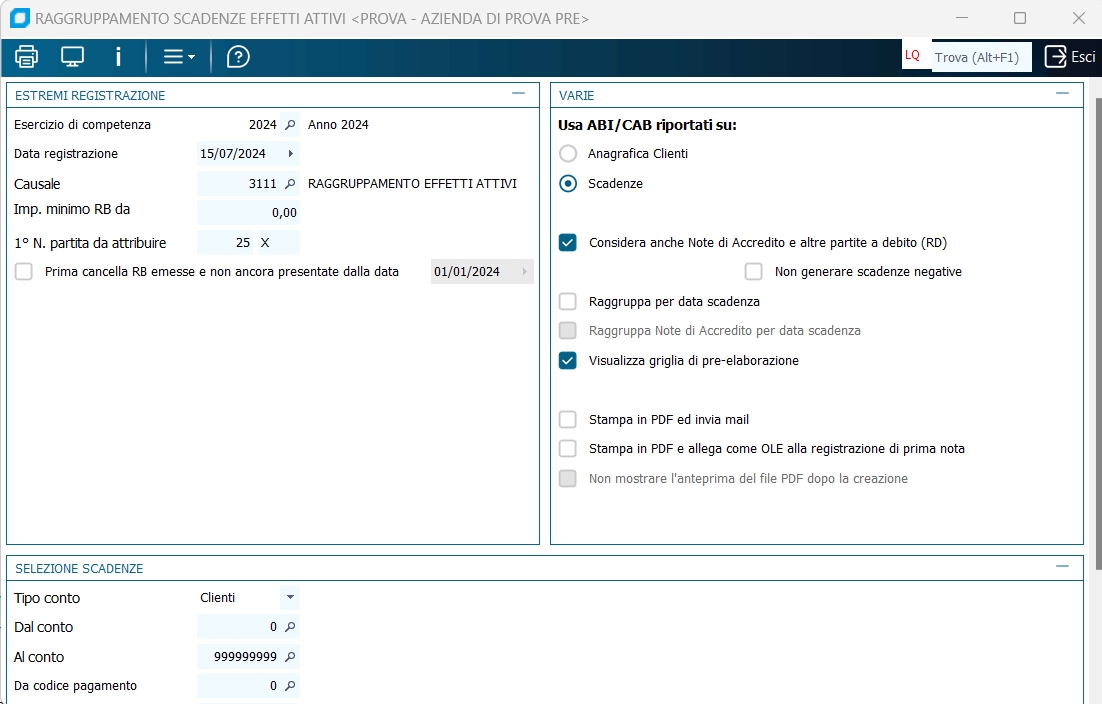 Questo programma raggruppa scadenze diverse comprese nell'intervallo di selezione; è possibile effettuare un raggruppamento per clienti, per fornitori e per diversi tipi di pagamento. Non è possibile raggruppare scadenze di tipo R.D. con RI.BA. poichè devono appartenere allo stesso tipo pagamento. Questo programma compensa Note di accredito e altre partite a debito con tipo pagamento rimessa diretta, il risultato è la generazione di una scrittura di prima nota che chiude le scadenze attive del cliente/fornitore e apre una scadenza, sempre sul cliente/fornitore, con N° e serie da attribuire per l'importo del saldo del raggruppamento. Il programma genera anche un avviso di estratto conto stampabile, nel quale è indicato che a saldo delle partite raggrupate è emessa un'unica RI.BA. o Tratta o RD con data di scadenza pari alla data indicata nel campo "Alla scadenza" della "Selezione". Quindi genera delle nuove registrazioni aventi data scadenza uguale a quella impostata nel campo "Alla Scadenza".