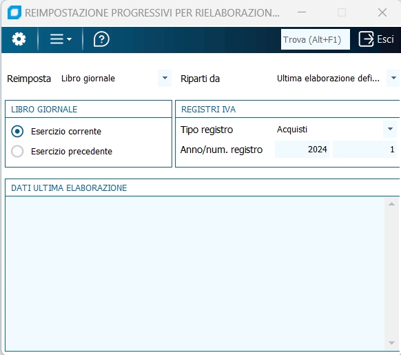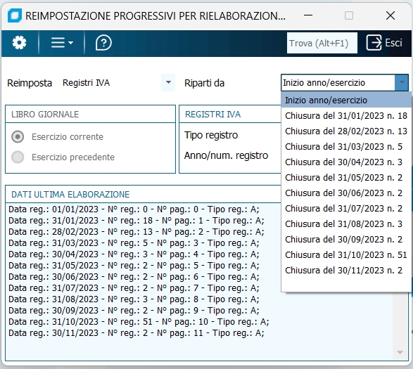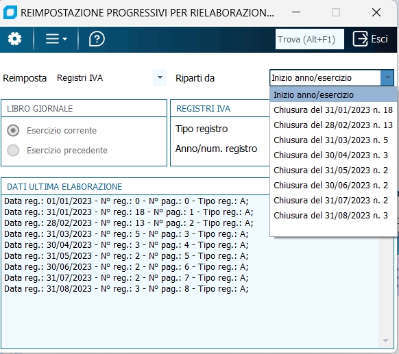 In questo caso, saranno aggiornati i dati della combo "riparti da" e la griglia dati ultima elaborazione.