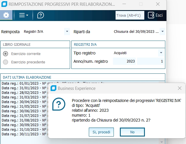 Procededo, saranno aggiornati i progressi registri iva, gli estremi di data registrazione, numero registrazione e numero pagina in anagrafica ditta e la combo Riparti da.