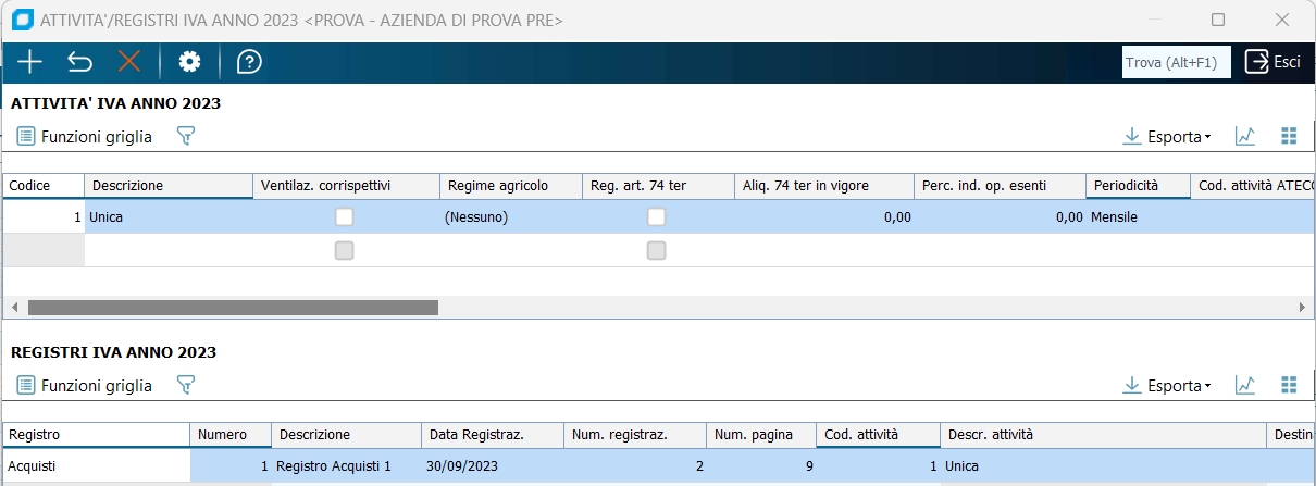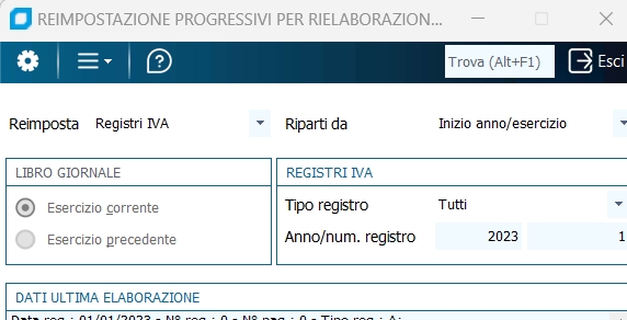 - per i registri IVA le sezioni interessate sono in "Anagrafica ditta - Dati generali ultimi registri IVA" e "Progressivi registri IVA";