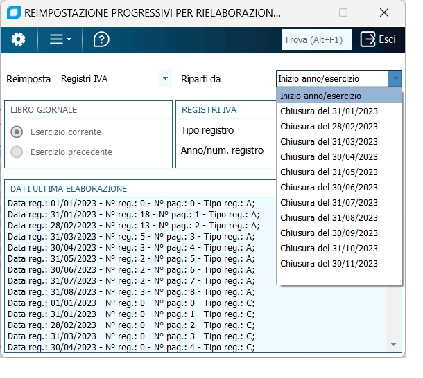 Registri IVA Selezionare il registro IVA da rielaborare. E' possibile reimpostare i progressivi registri IVA da inizio anno oppure da un periodo intermedio che non sia appunto l'ultima elaborazione definitiva.
