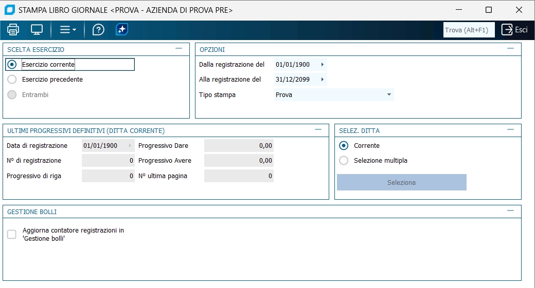 Questo programma stampa il Libro Giornale di contabilità relativo ad un determinato periodo: l'elaborazione dei dati inizia dalla registrazione contabile con data e numero posteriore alla data e numero dell'ultima registrazione già stampata nell'ultima stampa definitiva del Libro Giornale dell'esercizio corrente o precedente. Tali dati compaiono nella videata nel riquadro Ultimi progressivi definitivi, di cui è opportuno prima di ogni stampa verificarne l'esattezza; prima della prima stampa i dati devono essere pari a zero. In caso di rielaborazione, verificare attentamente che i seguenti dati, che ritroviamo anche nel programma di Anagrafica ditta, corrispondano a quelli risultanti dall'ultima stampa definitiva corretta di quel libro giornale: Data e numero ultima registrazione, Numero ultima Riga, Progressivo Dare, Progressivo Avere, Progressivo ultima pagina. Il programma, nel momento in cui viene elaborata la stampa, controlla e restituisce un elenco delle causali coinvolte nell'elaborazione che hanno il flag "stampa lg" non selezionato, che perciò non saranno considerate nell'elaborazione.