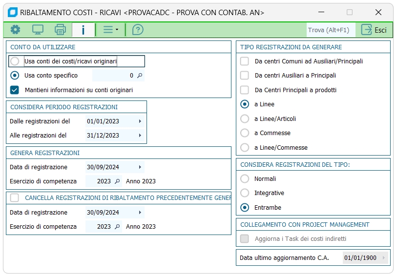 Questo programma genera registrazioni di pura contabilità analitica che rappresentano la ripartizione di costi e ricavi da centri comuni a centri accessori e principali, oppure da centri accessori a centri principali, o da centri principali sui prodotti, variamente denominati e distinti per linee, per linee/articoli, per commesse, per linee/commesse.