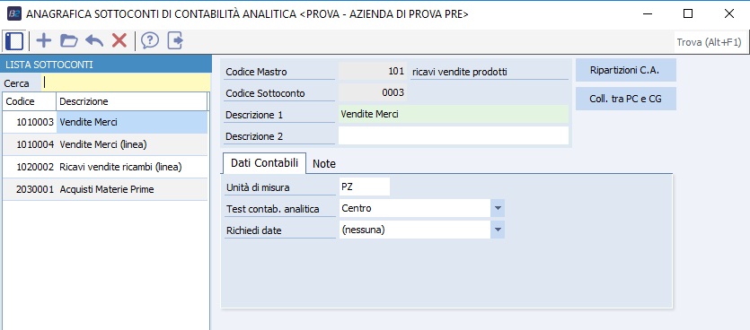 Questo programma consente di caricare i sottoconti, l'ultimo livello del piano dei conti di Contabilità analitica. Prima occorre aver caricato le classi ed i mastri di contabilità analitica.