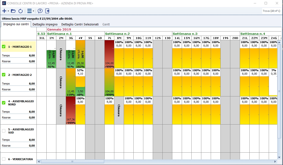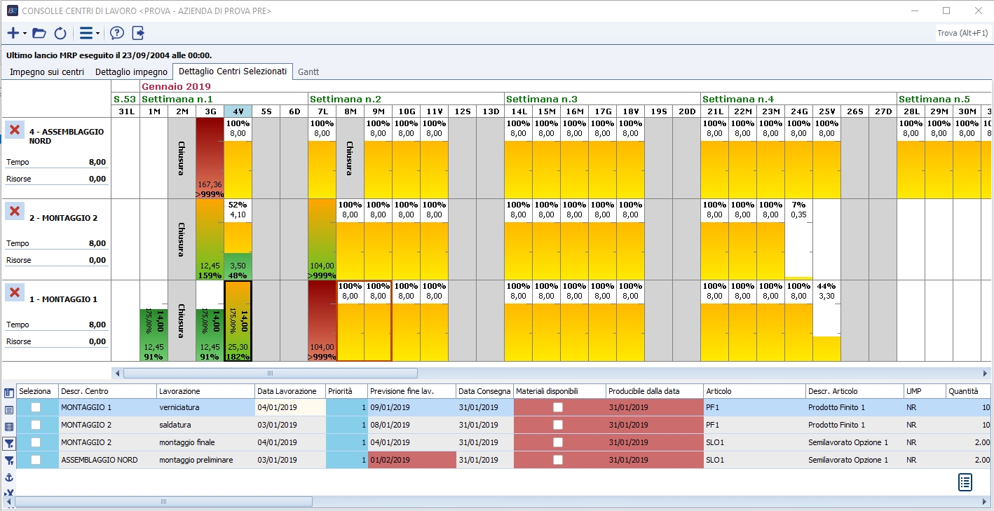 - In altro viene mostrato il carico di lavoro e la percentuale di occupazione delle lavorazioni che devono essere recuperate (righe gialle).