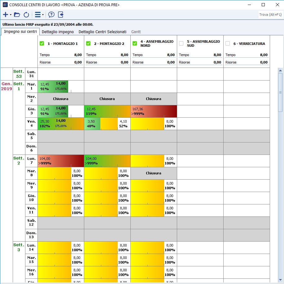 All'apertura il programma parte sul tab 'Impegno sui Centri' che mostra graficamente il carico di lavoro generato dalle proposte d'ordine di produzione e dagli ordini di produzione caricati in business. Il range di date di apertura viene definito da 2 opzioni di registro (vedi capitolo opzioni di registro).